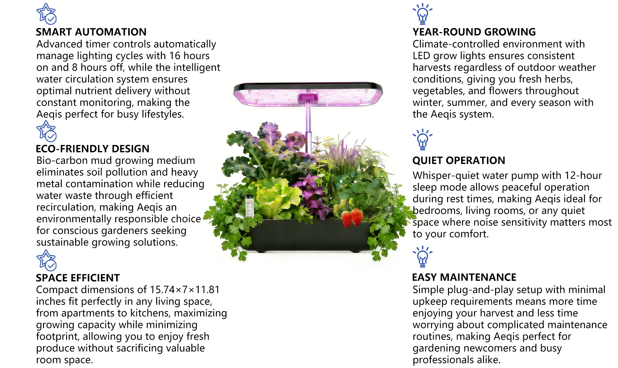 The Aeqis Hydroponics Growing System uses innovative soilless technology to provide a clean and efficient growing environment. Made with non-toxic, pollution-free materials, it eliminates the risks of heavy metal contamination, keeping your living space pristine while promoting faster, healthier, and stronger plant growth compared to traditional soil-based methods.