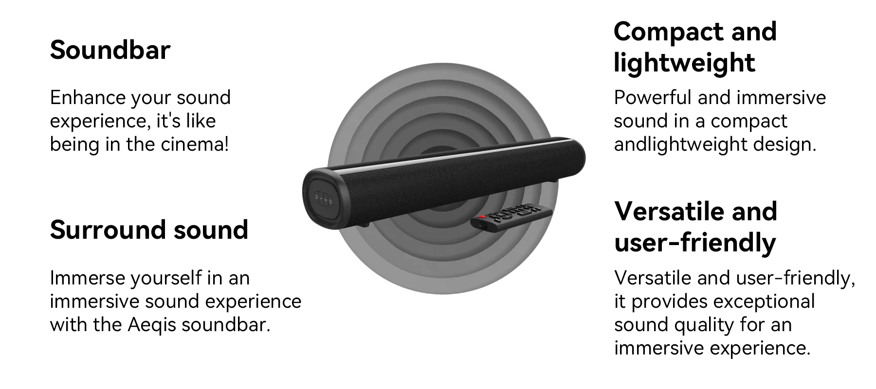 Aeqis boasts a powerful 40W omnidirectional output and 3.1 channels, complete with a wireless subwoofer that transforms this soundbar into the perfect complement for your television.